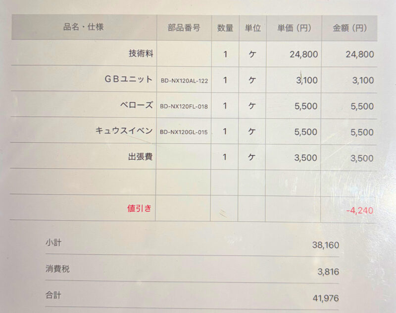 今回出してもらった修理見積もりはこちら。