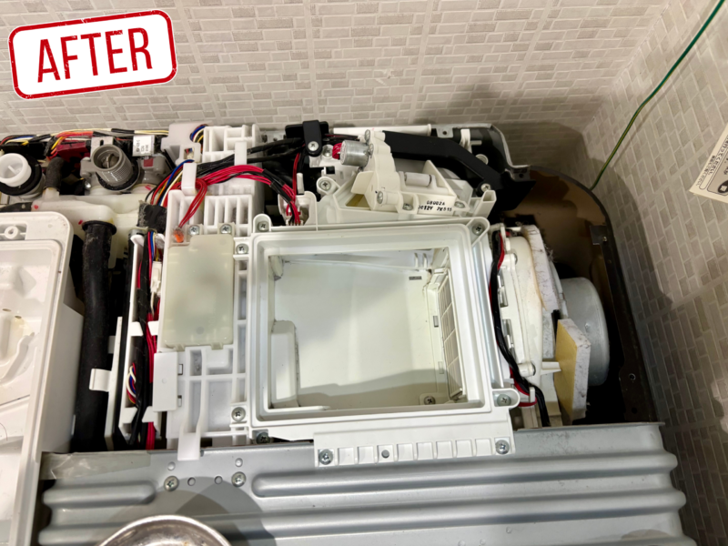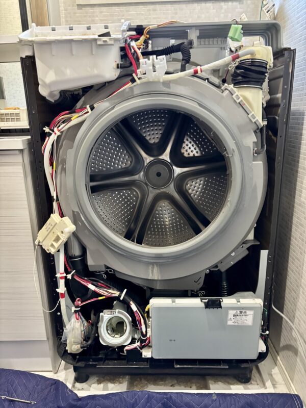 実際にここまで分解して中を確認しました。 ドラム式洗濯機の中はかなり複雑な構造で、 普段は見えない部分がたくさんあります。